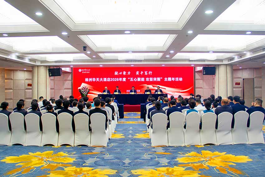 3月6日,株洲华天大酒店召开2026年度“五心聚能攻坚突围”主题年活动动员会,以“凝心聚力 实干笃行"为导向部署年度重点工作,酒店管理干部及核心骨干参会,为年度经营管理目标实现凝聚全员合力。