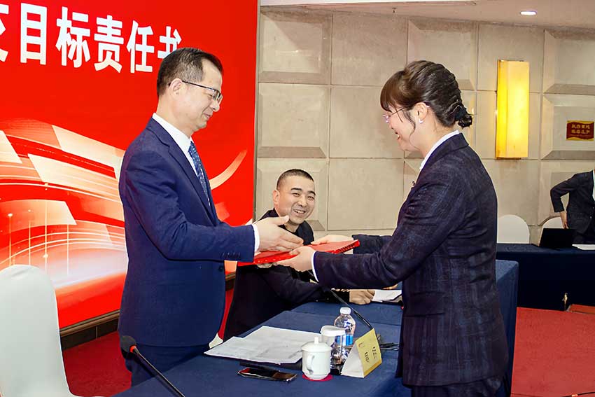 大会在店歌《永远的风采》声中启幕,餐饮总监陈玉兰女士宣读《关于开展株洲华天大酒店2026年度“五心聚能攻坚突围”主题年活动的通知》,清晰解读活动核心内涵、总体要求与实施举措,为全员年度工作开展明确方向。随后,各部门负责人依次向酒店领导递交年度工作目标责任书,将年度目标层层分解、责任到人,构建起上下联动、齐抓共管的工作格局,彰显各部门攻坚克难的坚定决心。